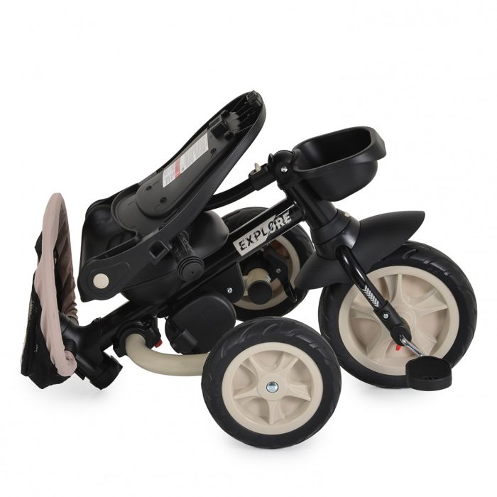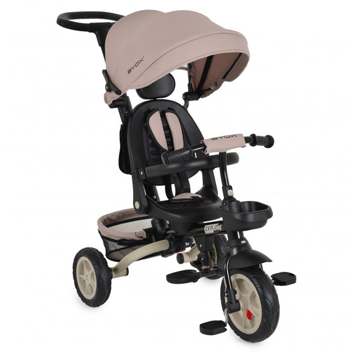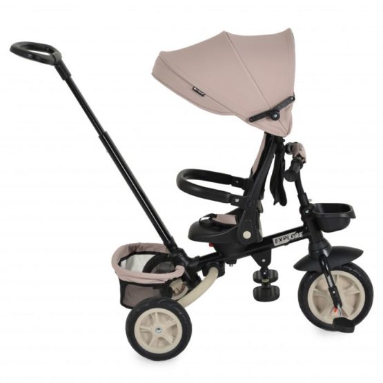 Može se koristiti bez nadstrešnice, ručke za roditeljsku kontrolu i sigurnosne ploče. Sklopivi zadnji okvir. Sjedište: rotirajuće za 360°; podesivi naslon.