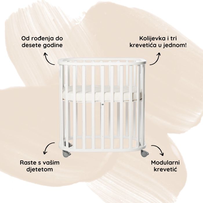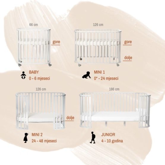 Iz osnovnog kompleta moguće je sastaviti kombinacije kolijevke i krevetića dovoljne da prate vaše dijete od rođenja do desete godine.