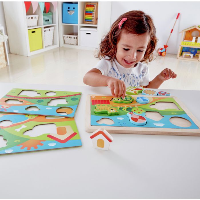 S jedne strane dijelovi slagalice mogu se slagati prema obliku i boji, s različitim nijansama iste boje koje idu zajedno.Nakon što riješite prvu slagalicu, igru ​​​​baziranu na bojama, okrenite slagalicu i pokušajte riješiti težu igru ​​​​baziranu na oblicima.