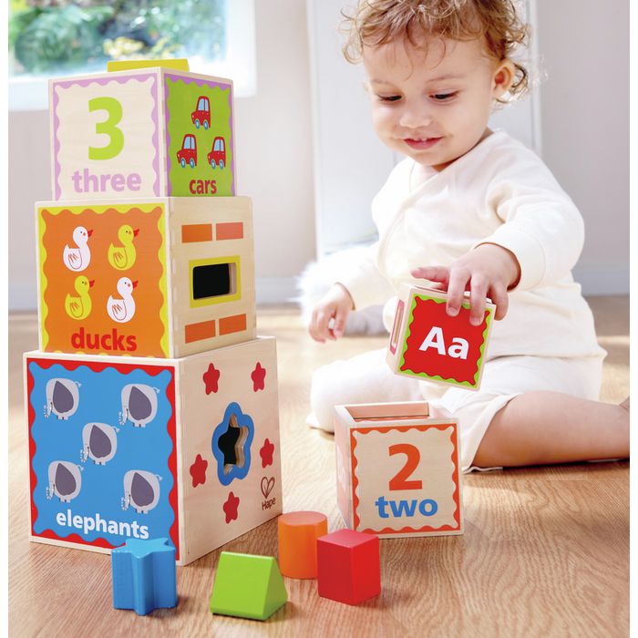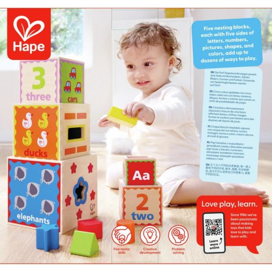 Ovi najprodavaniji blokovi savršena su multifunkcionalna igračka! Hapeova piramida za slaganje sadrži pet različitih blokova za slaganje, svaki s pet strana slova, brojeva, slika, oblika i boja, nudeći razne mogućnosti igre i učenja. Kvalitetna izrada od baltičkog brezovog drva nabavljenog iz ekološki održivih šuma stvara lagan, ali čvrst dizajn koji je izdržljiv, bez težine i potencijalnog oštećenja punog drva. Potiče djecu da razvijaju fine motoričke sposobnosti dok vježbaju slaganje blokova za gniježđenje i balansiranje različitih veličina. Djeca će voljeti višestruke načine uključivanja u individualnu i suradničku igru, potičući obiteljsko učenje i kvalitetno vrijeme. Hape igračke stimuliraju djecu kroz svaku razvojnu fazu, pomažući u njegovanju i razvoju njihovih prirodnih sposobnosti.