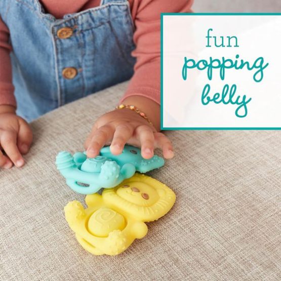 Ovaj set od dvije mekane silikonske grickalice dizajniran je kako bi bebama pružio različite teksture za umirivanje osjetljivih desni. S ovim zabavnim, ali praktičnim grickalicama, vaša beba može razvijati svoje rane fine motoričke vještine koristeći koordinaciju ruku i očiju kako bi pritiskala neodoljive senzorne trbuščiće koji pucketaju. Savršene su veličine za držanje i istraživanje znatiželjnih malih ručica, a istovremeno pružaju ugodno iskustvo stavljanja u usta za bolne zubiće koji nicaju. Petlja na stražnjoj strani svake grickalice olakšava pričvršćivanje na kopču za dudu ili bilo koje drugo prikladno mjesto kako bi uvijek bile pri ruci i nikada se ne bi izgubile. Nakon svake upotrebe, obrišite grickalice za brzo čišćenje. Infantino Pop Pals će vašem mališanu pružiti puno zabave i umirujuće udobnosti.