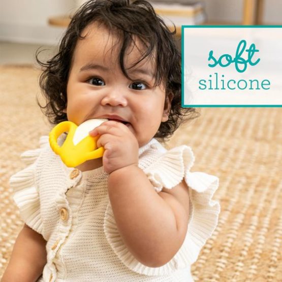 Ova silikonska glodalica bez BPA umiruje osjetljive desni i bolne zubiće koji nicaju. Izvrsna je za bebe kojima je potrebno nešto mekano za grickanje. Zanimljive teksture potiču senzorno istraživanje žljebova, krivulja i izbočina. Vaša beba može koristiti ovu preslatku glodalicu u obliku banane tijekom faza nicanja zubića i usta. Lagana je i savršene veličine za držanje i istraživanje u malim rukama. Lako se čisti brisanjem i spaja za olakšanje nicanja zubića u pokretu.