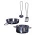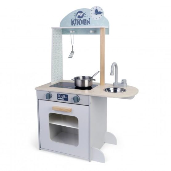 Drvena kuhinja s 4 dodatna pribora za kuhanje.