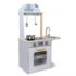 Ima vrata pećnice koja se otvaraju, sat, realistični sudoper i sudoper.