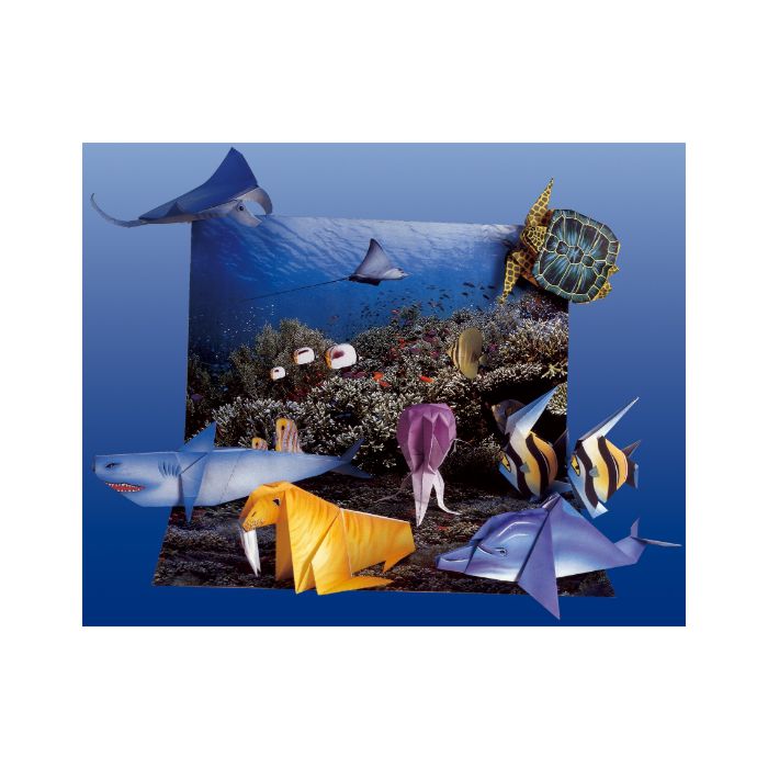 Set Origami Podvodni svijet sadrži sljedeće likove: mantu, kornjaču, 2 koraljne ribe, dupina, meduzu, morža, morskog psa, 1x lik presavijene kornjače i upute za savijanje.