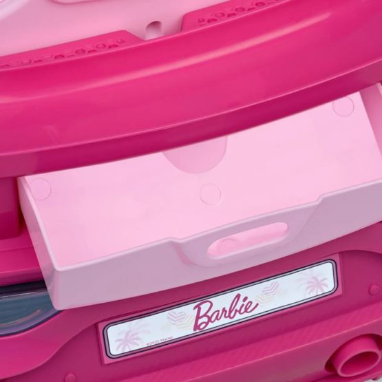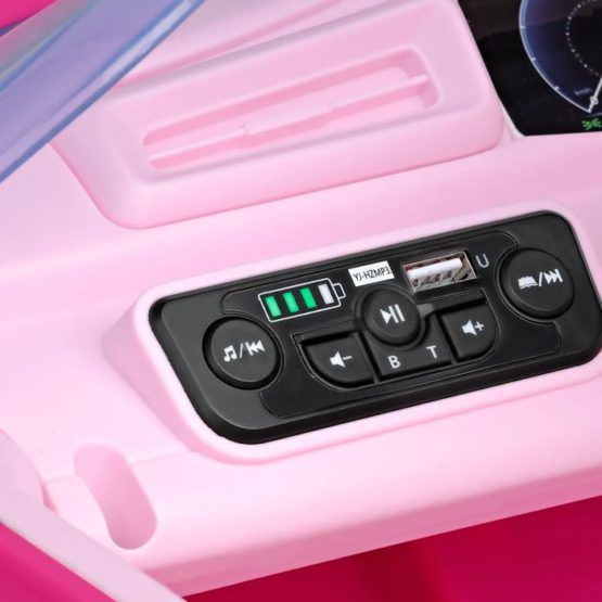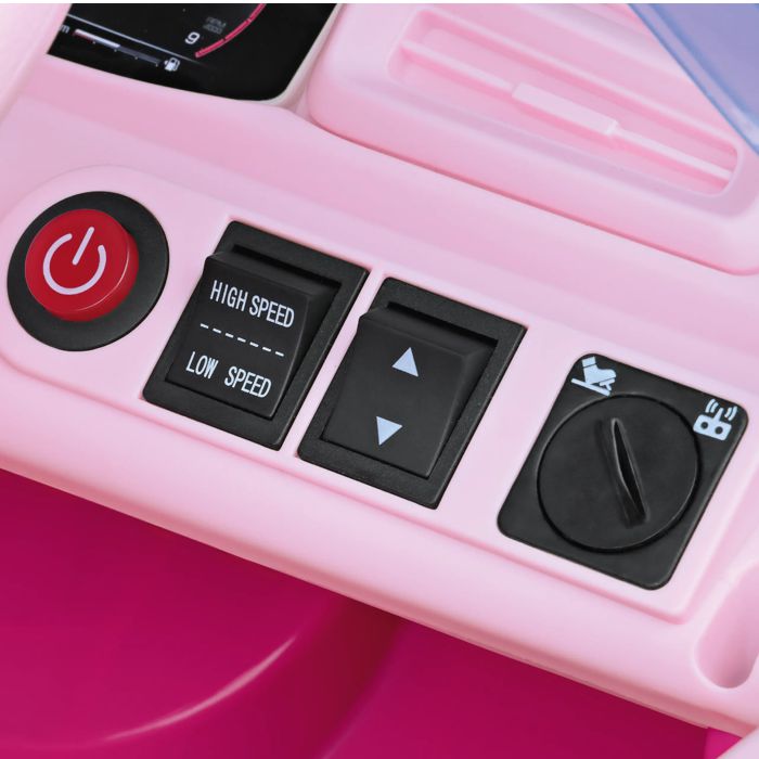 Daljinski upravljač omogućuje upravljanje vozilom iz daljine, odabir između 3 brzine i pomicanje u četiri različita smjera. Autić pokreću 2 motora (ukupno 60W). Gas i kočnica na jednoj papučici: Kada se otpusti papučica gasa, aktivira se kočnica koja zaustavlja autić.Dva posebna sjedala za Barbie lutke (nisu uključene u paketu). Elektronička nadzorna ploča sa tipkom za uljučene melodije u USB priključak. LED traka pokazuje razinu baterije. Prednja LED svjetla sjaje jarkim bojama.