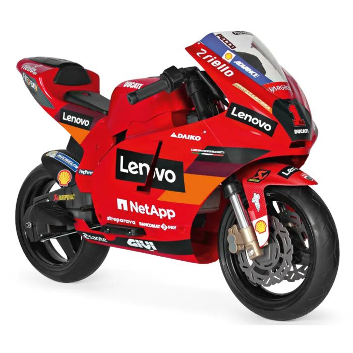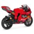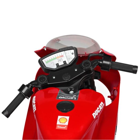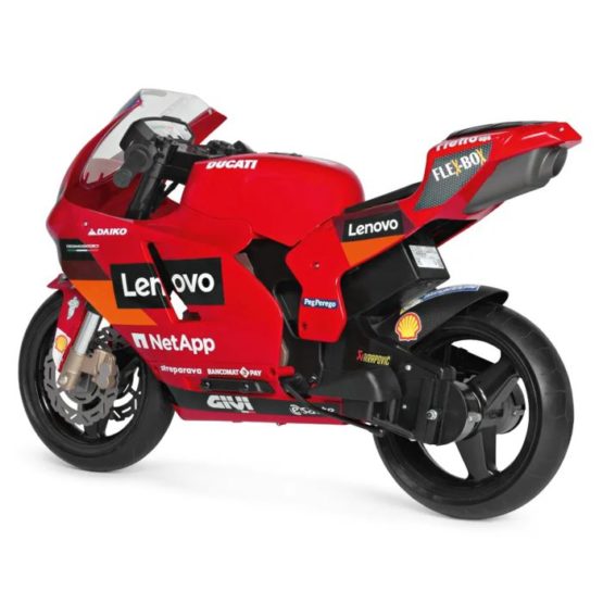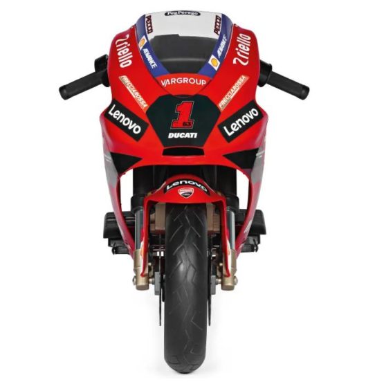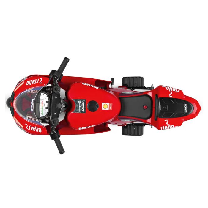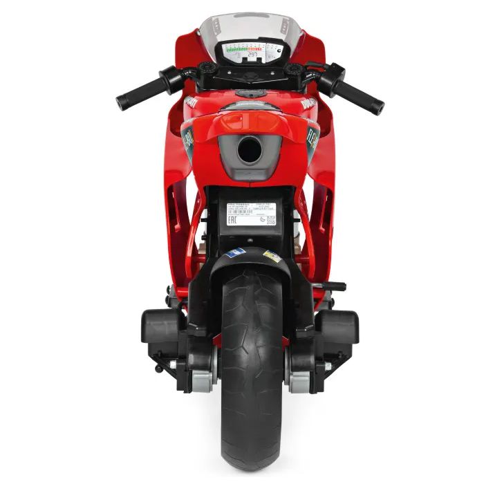 Električni motocikl Peg Perego Ducati GP za djecu: električni motocikl s bučnim motorom i baterijom od 12 V/8 Ah/100 Wh; koji vozi gotovo 8 km/h; za male motoriste od 3 godine i više. Odlična zabava s dva gumba na instrumentnoj ploči koji ispuštaju zvuk trube i rada motora. Ručka gasa: može postići 3,8 km/h u prvoj brzini i 7 km/h u drugoj brzini; najveću brzinu može podesiti odrasla osoba pomoću gumba ispod čepa za gorivo