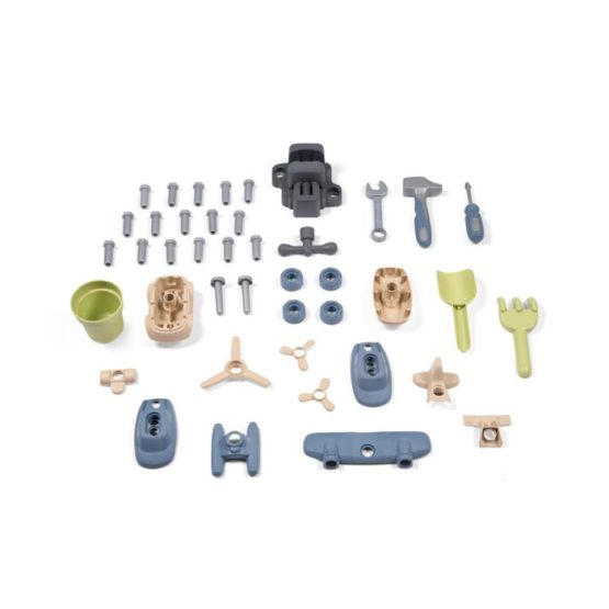 Paket uključuje 39 dodataka koji obogaćuju igru: odvijač, čekić, ključ, škripac, alat za zabijanje čavala, 2 vozila za montažu i ostale dodatke za male majstore. Vanjski zidovi su utisnuti s motivima životinja (mačke, ptice itd.), koji dodatno diverzificiraju kućicu.